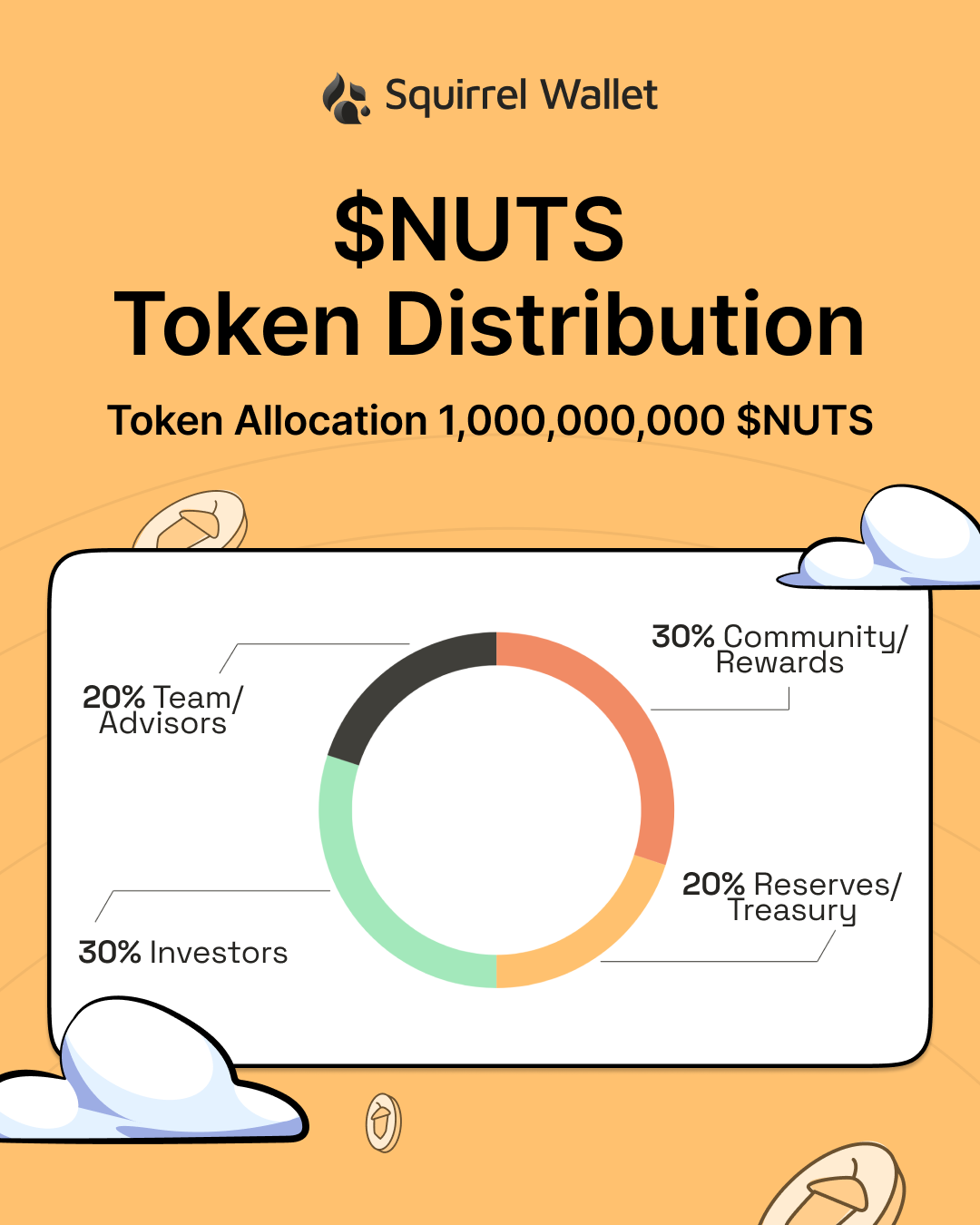 $NUTS is the native token of Squirrel Wallet, designed to power the ecosystem, reward users, and enable seamless transactions across supported blockchains. With a total supply of 1 billion $NUTS, the token is strategically allocated to ensure long-term growth, user incentives, and ecosystem sustainability.